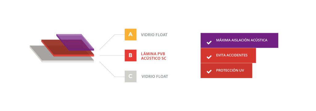 Este vidrio está diseñado para ambientes donde el confort acústico es prioritario. Su construcción: